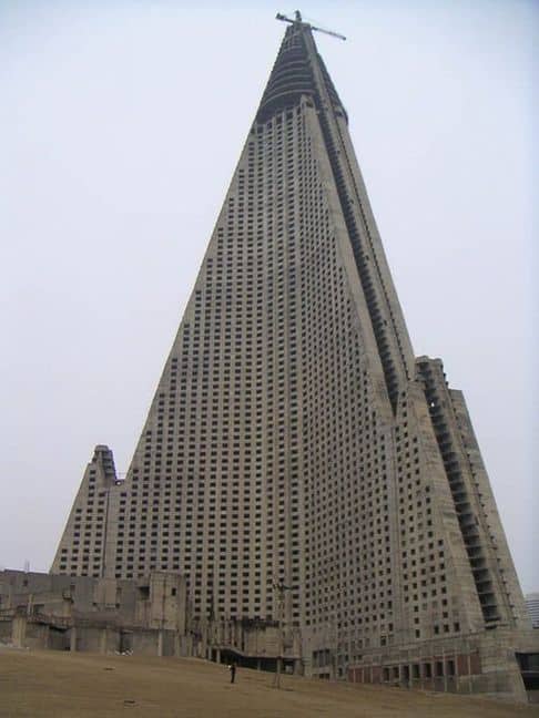 [su_highlight background=”#d5dbfe”]Il Ryugyong Hotel è un grattacielo di 105 piani in costruzione a Pyongyang, in Corea del Nord.[/su_highlight]La costruzione dell’edificio è iniziata nel 1987 ma, ad oggi, non risulta ultimata nonostante, dopo 16 anni di inattività, nel 2008 i lavori siano ripresi (con annessa copertura con pannelli di vetro di almeno una facciata). I lavori si sono fermati a causa delle disastrate finanze del governo e, più volte, questo ha addirittura negato l’esistenza al mondo della struttura in questione. I media mondiali lo hanno più volte definito “L’edificio peggiore nel mondo”, “Hotel della morte” e “Hotel fantasma”.