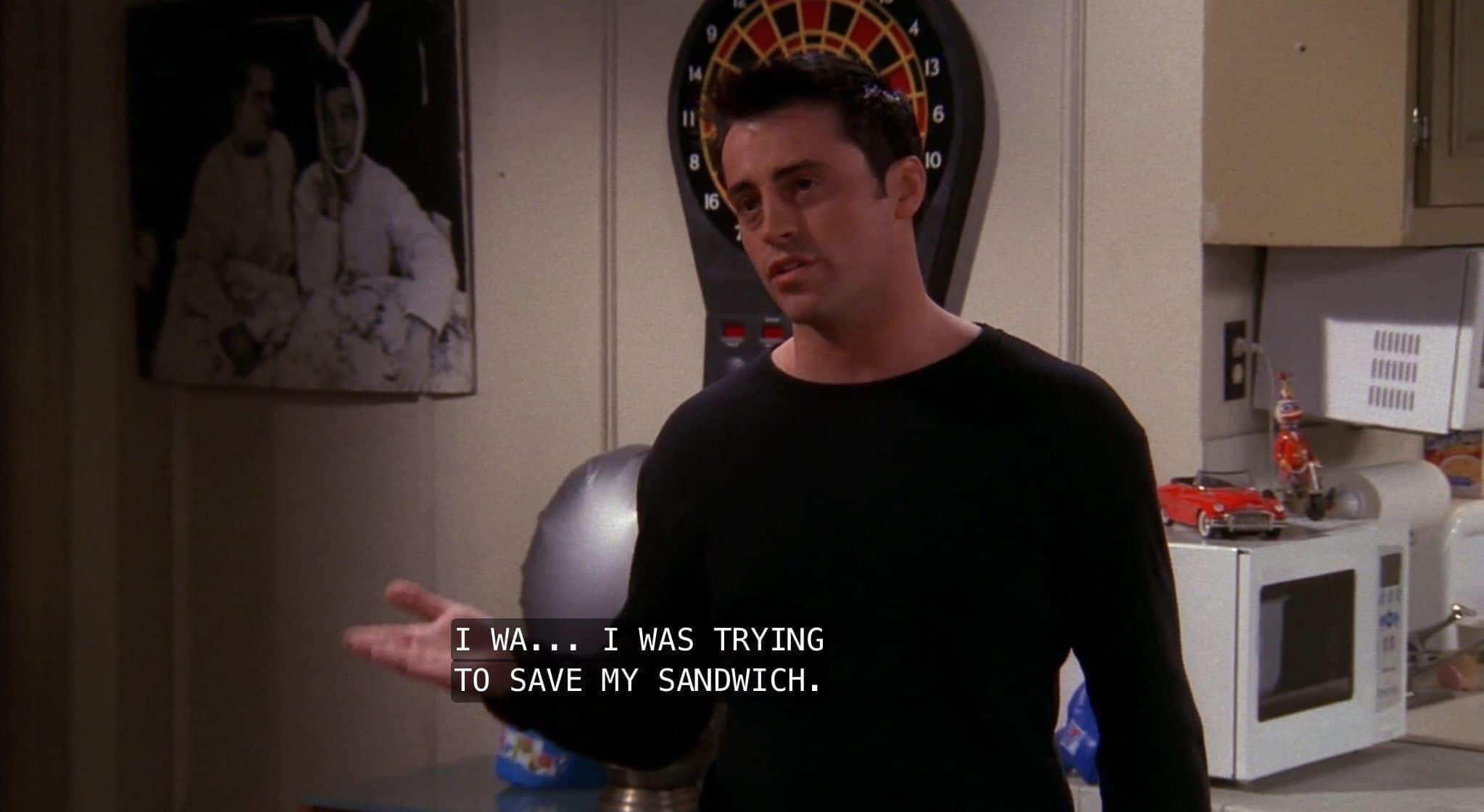 Più tardi Joey spiegherà che l’unica cosa che intendeva proteggere era il suo adorato panino, che in quel momento era proprio accanto a Ross!